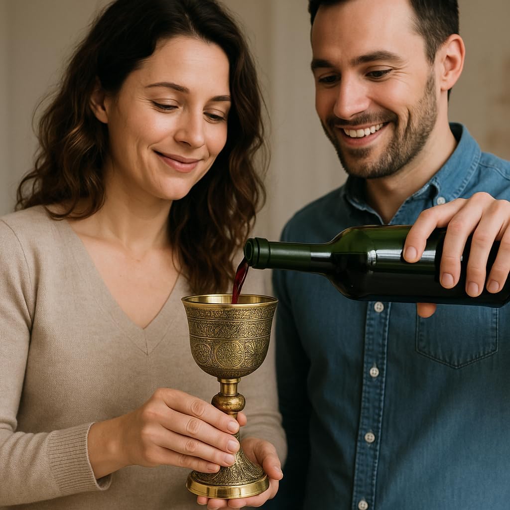 Elevate your dining experience with this exquisite brass vintage chalice goblet. Meticulously crafted with intricate detailing and an ornate design, this regal wine cup exudes a sense of grandeur reminiscent of the Renaissance era. Ideal for special occasions, religious ceremonies, or as a captivating centerpiece, this chalice is a true statement piece. Measuring approximately 1 foot in height, it boasts a sturdy brass construction that ensures lasting durability. Whether you're hosting a medieval-themed gathering or seeking a unique addition to your home decor, this chalice is sure to captivate and impress. Embrace the timeless elegance and rich history embodied in this remarkable piece.